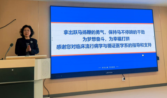 学系前任主任王束玫教授深情回顾了学系成立之初的奋斗历程。她提到,建系伊始,面对学科交叉融合的挑战,学系打破学科壁垒,探索协同育人路径,持续吸纳具有丰富临床经验与严谨方法学背景的教师,不断优化师资队伍结构,为教学与科研的融合发展奠定了坚实基础;正是凭借着这份初心与坚守,学系逐步发展壮大,形成了如今多学科融合、优势互补的良好局面。她结合自身多年的教学与科研经验,强调了临床流行病学与循证医学作为方法学在医学研究中的基石地位,并勉励在座的青年教师要珍惜学系当前良好的发展平台,既要潜心钻研教学方法,将复杂的知识点讲清讲透,也要注重自身科研能力的提升,将最新的研究成果反哺教学。她寄语全体教师,要继续保持学系团结协作的优良传统,薪火相传,为推动学科发展和人才培养质量再上新台阶贡献力量。